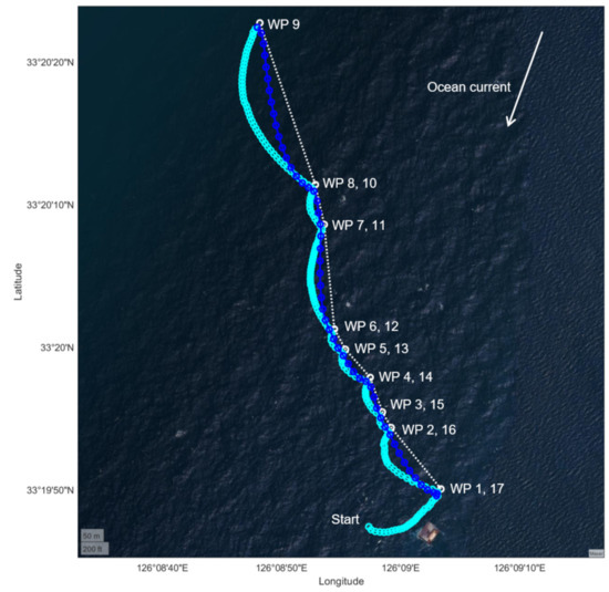 The targeted survey area was the wave power plant testing site built by Korea Research Institute of Ships and Ocean Engineering (KRISO), located on the south-west coast of Jeju Island. The vehicle path used to survey the cable line is illustrated in Figure 8. The waypoints were selected based on the draft of the power cable lines provided by relevant authorities. The line had several segments, and waypoints were given for the joint of the segments, as well as the starting and end points. The vehicle travelled back and forth along the same waypoints.