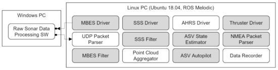 Low-level communication for thrust command, feedback, and battery management was performed through a microcontroller. Sensor acquisition and processing were implemented in a Linux PC running a robot operating system (ROS) [22], except for the raw sonar data processing software that ran on a Windows PC. The developed software components are shown in Figure 9. All sensor data were saved as automatically split files during the survey mission. The total size of the collected data was 47.5 GB for the survey path. The vehicle ran for approximately one and a half hours to complete this survey. The total travel distance was 2.56 km.