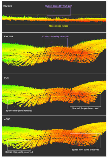 Figure 11 shows the effect of the SOR filter on the sonar point cloud. The raw sonar point cloud contains outliers due to the multipath effect and increasing noise in the side ranges. These can be removed by applying a conventional SOR with a tight rejection threshold. However, it also removes the sparse sonar points that should have been preserved. In contrast, the proposed v-SOR filters out the vertical outliers as well as side noises while preserving the sparse inlier point cloud.