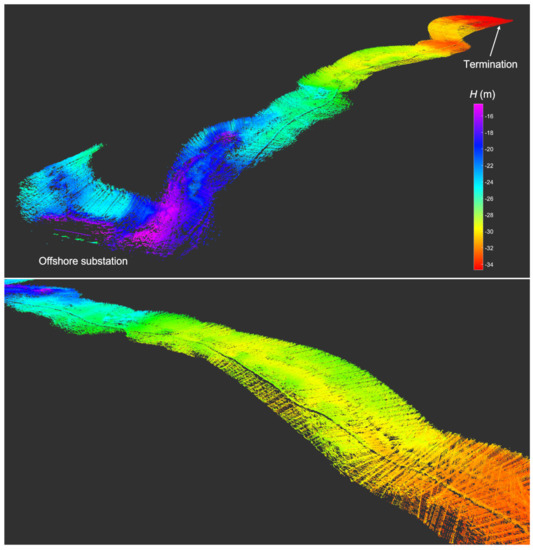 The final aggregated sonar-point cloud is shown in Figure 12. We can observe the entire segment of the power cable lines that starts from the offshore electrical substation (areas colored in magenta) to the termination point (areas colored in red). Owing to the consistent height estimation, the shape of the cable lines from the generated point clouds maintains consistency, even with overlapping survey paths. The quality of the generated point cloud in this step is also important in post-processing, as it can be directly used in mesh interpolation without additional outlier removal and to generate sharper seafloor maps. Furthermore, we expect the built map to be used as a draft during future construction works, such as inspection and maintenance, as all these point clouds were georeferenced using vertical datum. This also applies to the generated SSS image maps.