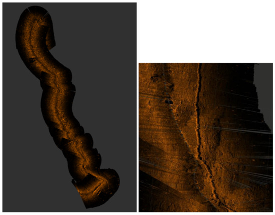 Figure 13 shows the sonar images generated from SSS. The sonar image produced a patchy image owing to the high roll and pitch motion of the ASV caused by the ocean waves and the new pixels drawn on top of the old pixels. However, we can clearly observe the offshore cable line laid on the seafloor, as shown in Figure 13. In particular, the stone bags used to anchor the cable lines placed on top of the cables can be seen in the SSS maps through the acoustic shadows created, while these cannot be seen in the MBES generated maps. Thus, we can exploit the advantages of using multimodal sonar sensors for offshore surveys.