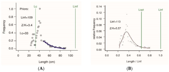 The graphical outputs of LBB for the Indian Salmon. Panel-(A) displays the accumulated length frequency (LF) data analyzed for estimating the priors for Lc,, Z/K and Linf,. Panel-(B) shows the Lopt, Linf and Z/K assessed by the fitting curve.