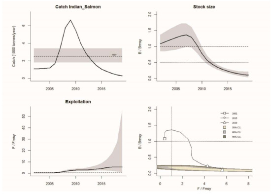 The current study applied two recent and powerful methods for estimating the stock status of Indian salmon (Leptomelanosoma indicum). Both methods exhibited similar results, identifying the severely overfished and depleted condition of this stock, which is very alarming for this commercially valuable and giant-sized Indian threadfin, L. indicum, fishery. These findings will help to formulate management strategies and conservation policies for protecting this valuable fish stock from extinction, and assist further development of this fishery in the BoB, on the coast of Bangladesh.