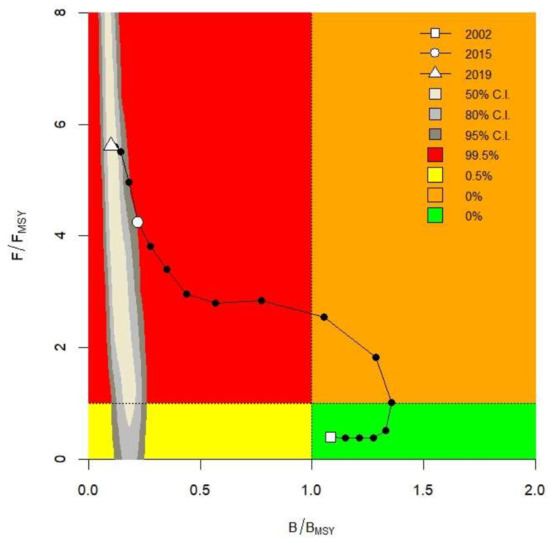 The BSM-derived BRPs for the L. indicum fishery in the study area are shown in Table 6. The biomass (1620 t) was significantly lower than the BMSY (15,600 t) and the fishing mortality F was higher than FMSY, which denotes the severely exploited condition of this fishery in the BoB, on the coast of Bangladesh (Figure 3). In addition, the findings of B/BMSY = 0.11 (<1.0) and exploitation (F/FMSY = 5.66) further justify the severely exploited conditions of L. indicum stock in the study area (Figure 4).