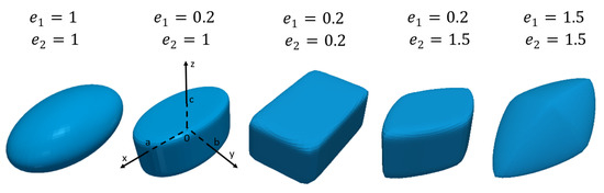 We aim to investigate the fluid flow induced forces and torques on non-spherical particles. Our main goal is to extend the currently available modelling options for non-spherical particles, as highlighted in the introduction. Since we want to consider a wider range of particle shapes, it is a good idea to employ a parametric surface definition approach. In order to enable shape manipulation options, we introduce a superellipsoidal particle [40,41,42] with four parameters , , and and fix its volume to , which is the volume of a sphere with diameter . The three semiaxes are