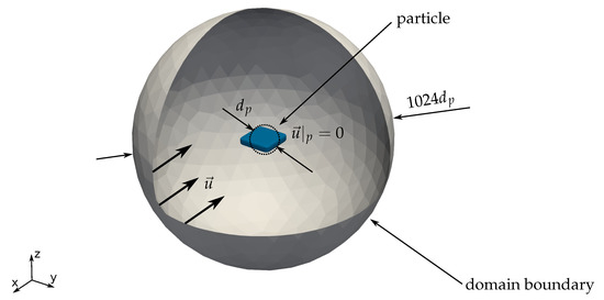 Numerical domain in the shape of a sphere, with the diameter of the . The particle under consideration is positioned in the centre of the domain, with its volume equivalent diameter . The boundary condition, on the surface of the outer sphere is a constant velocity field , while a no slip condition is imposed on the particle surface.
