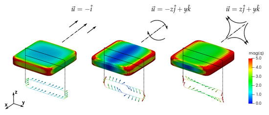 The boundary condition, imposed at the surface of the outer sphere (domain boundary), is a known velocity field. We decide to process the contributions of different resistance tensors separately. Following from that, we employ nine different velocity fields, to take in to account all three principal axes for the translation, rotation and shear flow. In the case of estimating the translation resistance tensor we prescribe the velocity corresponding to the translation of the particle in a stationary fluid, along the three axes of symmetry, namely (Figure 3, left). The unit vectors define the standard basis of the coordinate vector space. To obtain the rotation resistance tensor , we prescribe the velocity field corresponding to a uniform rotation of the particle, around the three axes of symmetry, namely (Figure 3, centre). Analogously, for the deformation resistance tensor we prescribe the two-dimensional pure shear velocity field, normal to the three symmetry axes, namely (Figure 3, right). At the same time, we prescribe a no-slip condition at the surface of the particle, to close the set of the required boundary conditions. According to (8)–(10), one can see that the result of such simulation is a traction at the particle surface , which is displayed in Figure 3. When integrated according to Equations (13) and (14), this yields the force and the torque exerted on the particle by the fluid.