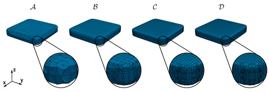 Boundary conditions include known values for , , , , , . Collocation points are placed only into nodes, where the value is unknown. A system of linear equations is set up for all unknowns, where in case of unknown or Equation (8) is used, in case of unknown or Equation (8) is used and in case of unknown or Equation (9) is used. Additional details of the BEM employed, such as implementation of integration, can be found in [38,39].