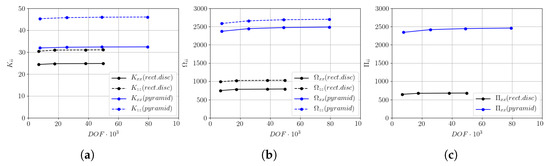 Demonstration of mesh convergence, by comparing the components of: (a) translation, (b) rotation and (c) deformation resistance tensors, for two superellipsoids: the rectangular disc (, , , ) and pyramid-like particle (, , , ).