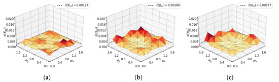 Modified relative errors are presented, with respect to and , for the examples of tensor components , and , shown at (a–c) sections respectively. Parameters and are fixed to 5 and 3. The average error for the plot is displayed in the top right corner.