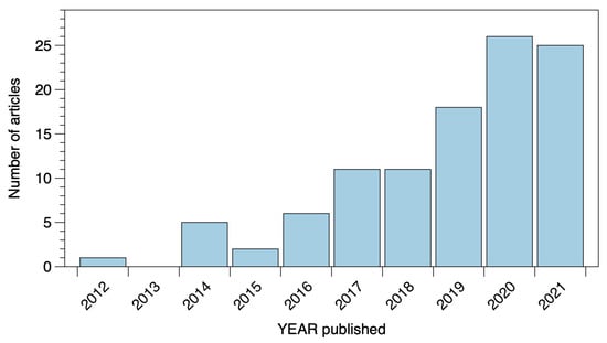 Number of review articles published each year about eDNA between 2012 and 2021, Web of Science database. Searched on 27 November 2021; n = 106. On plot, n = 105, because one article had no year assigned. The search is described in Appendix A.1.