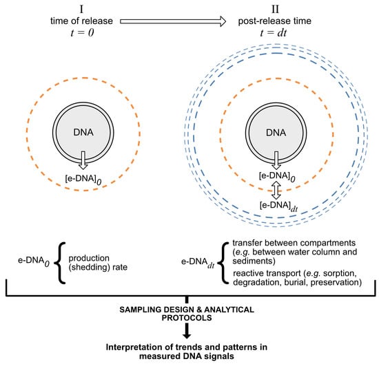 DNA has its own dynamics once released in the environment ([52]; Figure 2). Any environmental sample contains a mixture of DNA molecules all having different sources and ages that have been exposed to biotic and abiotic environmental gradients, including: heterotrophic interactions, UV light, temperature, pH and salinity [53,54,55]. In marine and other aquatic environments, eDNA will disperse, degrade and interact with other organisms, solutes and particles in the water column and sediment and DNA molecules can undergo a number of complex biotic and abiotic transformations, which alter their molecular characteristics [52]. However, important uncertainties remain because insufficient experimental work has been done on these processes ([53]; see Appendices Appendix A.2 and Appendix A.3). Nonetheless, for EIA studies, these processes must be understood to be able to simulate DNA behaviour under the environmental conditions of a project site. This information is needed to guide and inform decisions about sampling protocols, analyses and other interpretations.