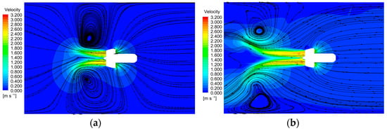 The velocity streamline diagram of the ducted propeller full-scaled flow field under different navigational speed conditions when the impeller rotational speed is 2000 r/min is shown in Figure 9. It can be clearly seen in the working process of the ducted propeller that the fluid enters the thruster through the inlet of the duct, works under the lift of the impeller and with the velocity increasing, and finally ejects from the tail nozzle to mix with the low-velocity fluid at the outlet of the propeller flow field. When the navigational speed is low, a pair of symmetrical vortices with opposite rotation directions are formed on both sides of the wake area. The symmetrical vortices formed in the mooring state are closer to the duct outlet, and the mainstream area of the velocity flow field is shorter. With the increase of the distance, the influence of the impeller hub gradually increases, and finally it bifurcates into two streams of fluid at the end of the velocity mainstream area. However, as the navigational speed increases, the pair of vortices in the wake area gradually disappear and the flow lines become more layered. This indicates that the efficiency of the propellers changes as the navigational speed increases.