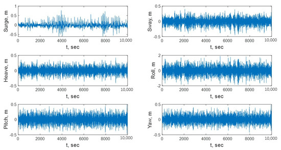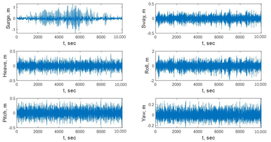 Figure 9, respectively. The surge and sway motion are relative to the motions of the delta and the heave and rotational motions are absolute. However, in such conditions, the heave and rotational motions of the Delta are minimal and, therefore, negligible. The frequency position of the ship in all load cases are presented in
