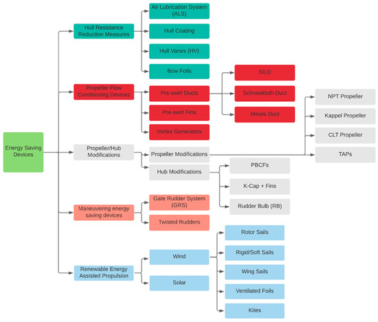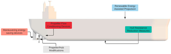 Energy savings can be achieved through numerous methods, for example, technical measures such as hull optimisation, waste and heat recovery systems installed on the main propulsion plant, and operational measures such as route optimisation, slow steaming and maintenance optimisation [42]. However, this review of focused on energy-saving devices that can be retrofitted or incorporated into new builds on the exterior of the ship.