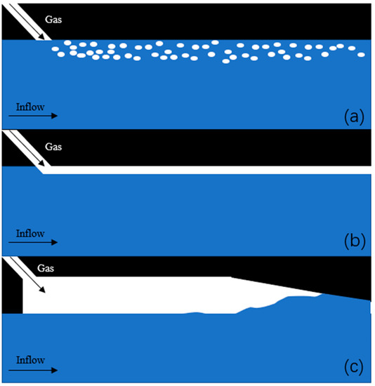 Three ALS styles, (a) bubble drag reduction, (b) gas layer drag reduction, and (c) gas cavity drag reduction.