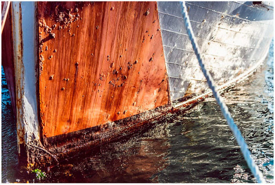Hull coating (HC) is also an effective way to reduce the hull resistance via reducing the frictional resistance. As the operation time of a ship increases, the roughness of the hull surface immersed in seawater will increase due to marine biological fouling, shown in Figure 5. As a result, the marine biological fouling causes increased weight and decreased speed, and then it causes an increase in fuel consumption, up to 40% [58]. Abbott et al. [59] reported that, for a 15,000 t deadweight dry-cargo vessel in a coating-failure condition, the journey costs increased by about 77% comparing to a coated condition. The hull coating is necessary for ships in antifouling and the choice of hull coating based on the vessel’s working purpose, cost and maintenance cycle. The development of the antifouling coatings is generally divided into two directions, which are biocide and foul release.