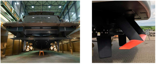 Hull Vane is an underwater fixed wing fitted after the vessel stern, and it can be retrofitted to existing ships or integrated into new designs (see Figure 6). Hull Vane reduces fuel consumption via following four ways: the lift can provide a forward force as a thrust force; the vertical force provided by lift can correct the trim; the transom wave can be reduced by the negative pressure on the upper surface; and the water resistance on the foil surface can dampen the pitching motion of the vessel and reduce the additional wave resistance [66]. Bouckaert et al. [67] reported CFD analysis of a Holland Class 108 m Oceangoing Patrol Vessel (OPV) applying a Hull Vane. The results showed that the total drag reduction achieved 15.3% and the Hull Vane provided a positive effect on the seakeeping of ships. For 2 m waves, a 2.4% heaving RMS (root mean square) of reduction and an 8.1% pitching RMS of reduction can be provided. Regarding the case of 4 m waves, the reduced heaving RMS was 3.1% and reduced pitching RMS was 6.8%. Furthermore, a 12.5% reduction in fuel consumption can be provided by applying Hull Vanes on Holland Class 108 m OPV [68]. In another CFD study of the Hull Vane application on 50 m Patrol Vessel of AMECRC#13, by Uithof et al. [66], an obvious drag reduction was obtained, up to 32.4%. Meanwhile, it is affected by where it is positioned, and the horizontal position has more drag reduction difference, which is up to 13%, but between Froude number (Fn) 0.6–0.8, the differences are small due to the more uniform wake. Furthermore, it should be noted that the Hull Vane could provide a 20.9% reduction in amplitude in regular waves, which had 50 m length and 1 m height, and this phenomenon had a significant benefit for a hydrogen-powered ship in reducing pitching motion and improving stability. In another study of 167 m RoPax vessel, by Uithof et al. [69], the tank tests using an 8 m model showed the drag reduction achieved 10.1% at 17 kn and 15.5% at 21 kn. Hagemeister et al. [70] analysed the drag and propulsion effect of the appended Hull Vane and the integrated Hull Vane on a 61 m patrol boat by CFD method. The fuel consumption reduction in the appended Hull Vane was about 15% and for the integrated Hull Vane, it was about 9%. Furthermore, the performance of a retrofitted Hull Vane applied on a model DTMB 5415 hull was investigated in the towing tank and the full-scall performance also was predicted by two methods [71]. This research showed, in the model-scall test, Hull Vane provided 3.8% and 5.5% of the drag reduction in still water and waves, respectively, and predicts that the drag reduction was about 10% in the full-scall application. In sea trials, the Hull Vane showed a significant effect in drag reduction. A sea trials study using a 55 m supply vessel Karina retrofitted with Hull Vane showed a 15% drag-reduction effect compared with a vessel without Hull Vane. Another vessel, which was a Dutch yacht integrated Hull Vane, obtained a drag reduction in up to 23% [72].