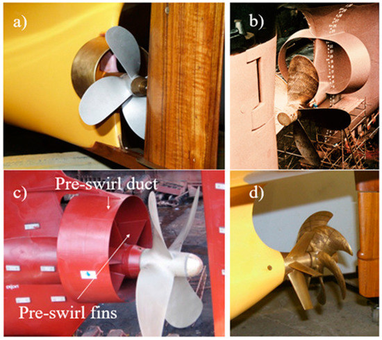 Existing propeller flow conditioning ESDs: (a) SILD duct (reproduced with permission from [90]; copyright HSVA, published by Symposium of Marine Propulsors), (b) Schneekluth Duct (reproduced with permission; copyright Schneekluth), (c) Mewis Duct (reproduced with permission; copyright Becker Marine Systems), and (d) Pre-swirl Fins (reproduced with permission from [90]; copyright HSVA, published by Symposium of Marine Propulsors).