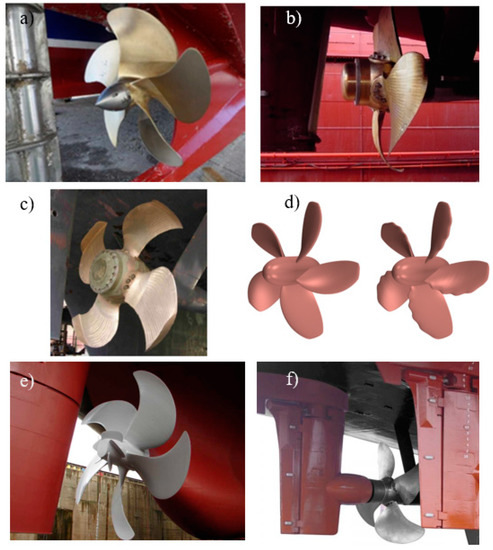 Existing and emerging propeller and hub modification ESDs: (a) NPT propeller reproduced with permission (copyright University of Strathclyde); (b) Kappel Propeller reproduced from Chekab et al. [107] (CC-BY); (c) CLT propeller reproduced from Chekab et al. [107] (CC-BY), published by Science and Education Publishing; (d) TAPs; (e) PBCFs adapted from Korrigan/Wikipedia https://commons.wikimedia.org/wiki/File:Sokoto_propeller.jpg (CC BY) accessed on 5 January 2022; (f) Rudder Bulb (reproduced with permission; copyright Becker Marine Systems).
