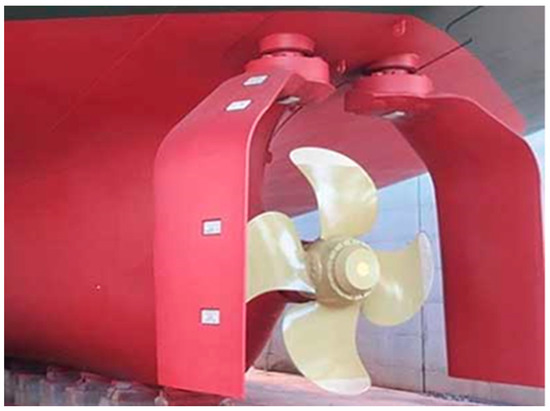 Over the past 5 years, an innovative type of twin rudder concept, gate rudder, has been designed and developed. The Gate Rudder (GR) concept was first introduced by Sasaki [115] and aimed at recovering part of the viscous resistance losses by the propulsion system, as shown in Figure 11. The innovative rudder system has two rudder blades with asymmetric sections located aside the propeller. Each blade can be controlled independently, achieving excellent performance for both manoeuvrability and superior propulsive performance, owing to a duct effect of the two rudder blades. Sasaki et al. [116] presented a potential energy saving of up to 7–8% with a gate rudder in a model test and numerical simulation. Sasaki et al. [108] showed performance of a gate rudder on a 2400 GT container ship in a full-scale sea trail. Based on both sea trial and voyage data, a remarkable 14% fuel saving is indicated for the gate rudder compared with her sister ship. The resistance characteristics of the gate rudder make the ship have both superior turning and course keeping ability. It will make a ship safer in the heavy sea conditions and manoeuvring system will be more effective using the gate rudder.