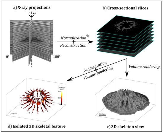 Workflow for acquisition and processing of tomographic datasets of coral recruit skeletons. (a) X-ray projections are acquired from different angles of the skeleton with incremental rotation (0° to 180°); (b) following normalization (gray star = additional details are shown in Figure 2), tomographic cross-sectional slices are reconstructed; (c) cross-sectional slices are stacked and processed into 3D views of the recruit skeletons; (d) AI-based segmentation and classification are performed so that the features of interest can be analyzed and visualized in 3D. An example distribution of RAD thicknesses is shown.