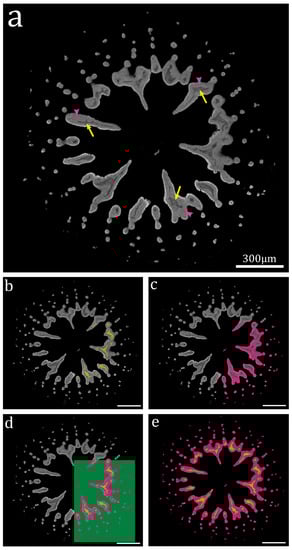 Overview of the DL (deep-learning-based) image segmentation process. (a) Example tomographic cross-sectional slices across the skeleton of a primary polyp before segmentation, revealing RADs (dark gray areas, yellow arrows) enclosed within TDs (light gray areas, pink arrowheads). (b,c) Manually delineated RADs (b; marked in yellow) and TDs (c; marked in pink) defined in a confined region within the training dataset. (d) Complete region manually delineated as training dataset, showing all three features (RADs in yellow, TDs in pink, and air spaces in green). (e) Result of the complete dataset processed by automatic DL-based segmentation. The AI network was applied to all slices within the stack, and it has automatically successfully distinguished RADs (yellow) and TDs (pink). Scale bars: 300 µm.