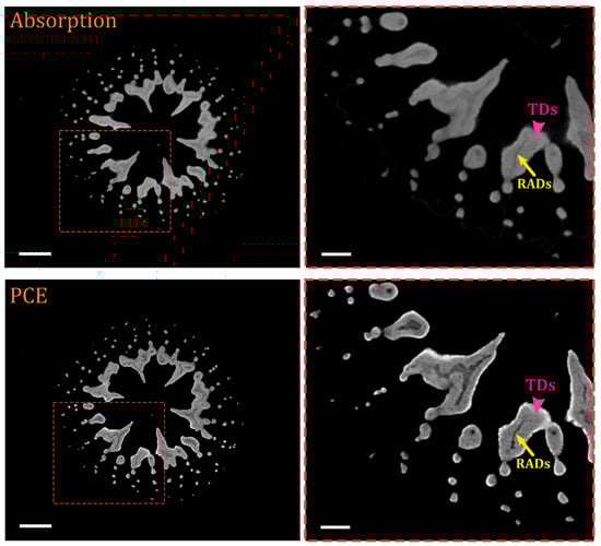 We reconstructed high-resolution tomography datasets of up to 1000 cross-sectional slices per scanned coral primary polyp, each amounting to a total of 54 GB of data. Each reconstructed image presents the complete form of the original coral skeleton including details of the internal skeletal architecture. In the PCE-CT images, strong differences in contrasts within the skeleton revealed clear internal variations in mineral distribution (Figure 4). Such variations coincide with previous observations of RADs possessing a less compact arrangement of the aragonite aggregates and a higher amount of organics compared to TDs [,,,,,,,]. Absorption images further confirm variations in mineral density between skeletal regions, though with blurry edges due to the poor signal. These scans show that RADs are indeed less dense than the surrounding TDs (~20% lower density; Supplemental Figure S2). This clear difference in density allowed us to ascertain that the contrasts observed by PCE-CT correspond to RADs and TDs in all phase contrast enhanced datasets. To allow for volumetric quantification and 3D visualization, image segmentation has to be applied, which requires clear boundaries to be present between different features []. The PCE-CT imaging mode appears, therefore, to be perfectly suited for the purpose, as the interfaces between RADs and TDs are accentuated and easy to identify, especially when compared to absorption images (Figure 4).