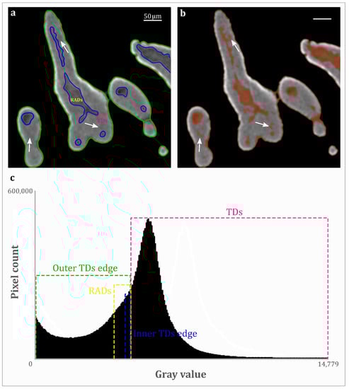 Conventional segmentation methods typically rely on choosing cut-off gray-values and are often based on the voxel intensity histograms. By applying a thresholding, the image can be segmented into the features that are below or above defined threshold values []. A gray-value histogram of an example coral skeleton shows that no clear distinction exists in gray-values corresponding TDs and RADs, as there is an overlap between the intensity ranges (for example, see gray-values of the margin of TDs facing the exterior of the skeleton and facing the RADs in Figure 5a,c). Phase-contrast images in fact are edge enhanced, meaning that both the brightest and lowest intensities of the image are found in the margins delineating the edges and internal boundaries of different densities and interfaces in the sample, and meaning that different features of interest may have the same “color”.