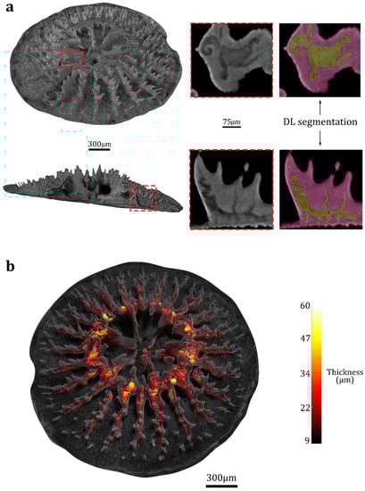 Deep-Learning-based image segmentation and quantitative 3D reproduction of segmented RADs and TDs. (a) Two example 3D renderings of a primary polyp skeleton virtually sliced in the transverse plane (upper row) and in the longitudinal plane (bottom row). Red dotted lines show enlargements of the sliced skeleton that have been segmented using DL (segmented TDs and RADs are colored in pink and yellow, respectively). DL, Deep Learning. (b) Segmentation of RADs and TDs across the entire stack of slices allows 3D separation of features and quantification, including details of local thickness (µm).