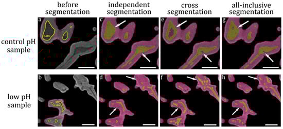 Further visual evaluation of the different segmentation outcomes reveals that applying a network trained using all tomographic datasets (named all-inclusive segmentation) provides a much improved segmentation performance compared to the cross segmentation (Figure 7e–h). These observations are supported by the measurements of the mean per-slice percentage of RADs area over the total area of the skeleton (Figure 8a,b). For both control and low pH datasets, the all-inclusive segmentation yielded a significantly better estimation of such percent area than the one produced by the cross segmentation (for the control pH dataset: mean per-slice difference of −0.95% ± 0.10 between the % RADs area/total area obtained with independent segmentation and the one obtained with all-inclusive segmentation, Wilcoxon test, W = −13081, p < 0.0001; for the low pH dataset: mean per-slice difference of +2.65% ± 0.15 between the % RADs area/total area obtained with independent segmentation and the one obtained with all-inclusive segmentation, Wilcoxon test, W = −13651, p < 0.0001)(see red dots compared to yellow dots in Figure 8a and purple dots compared to light blue dots in Figure 8b). These results indicate that variations in the coral geometries themselves increase the variability of shapes encountered by the model during training, which in turn substantially increases the robustness of the DL-based segmentation performance.
