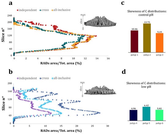 Evaluation of the DL-based segmentation performance based on the per-slice estimation of the area of the coral skeletal features and skewness of the distributions of the RADs-TDs shape configuration across samples. (a,b) Measured per-slice area of RADs over the total area of the skeleton (RADs + TDs) estimated using independent, cross, and all-inclusive segmentations (as shown in Figure 7) in the case of a control pH sample (a) and a low pH sample (b). The slice number indicates the progression through the recruit’s skeleton going from the base to the top, as illustrated by the coral skeletons on the right side of the graphs. Note how, for both control and low pH datasets, the per-slice area of the RADs obtained with all-inclusive segmentation gets closer to the value obtained with independent segmentation (red dots versus yellow dots and purple dots versus light blue dots, respectively) compared to the per-slice area obtained with cross segmentation (red dots versus green dots and purple dots versus blue dots, respectively). (c,d) Skewness of the distributions of the per-slice RADs-TDs shape configuration in control pH (c) and low pH (d) samples (see also Supplemental Figure S3). The ratio of the RADs perimeter/area over the TDs perimeter/area (“C”) was computed as an estimate of the relative shape of the skeletal features across the recruit skeletons. The skewness values are used as a metric to evaluate the degree of the RADs-TDs shape variation across datasets.