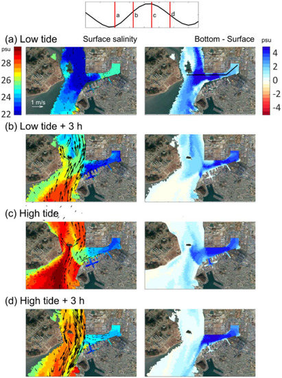 - Bowen, M.M.; Geyer, W.R. Salt transport and the time-dependent salt balance of a partially stratified estuary. J. Geophys. Res. Ocean. 2003, 108, 3158. [Google Scholar] [CrossRef]
