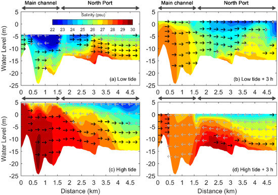 4.2. Along-Port Cross-Sectional Salinity and Current Profile