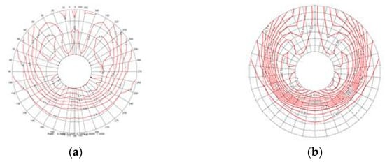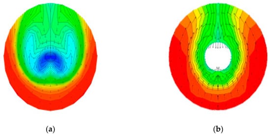 Comparison of nominal wake between EFD and CFD: (a) Wn = 0.452 (EFD); (b) Wn = 0.440 (CFD) [25].