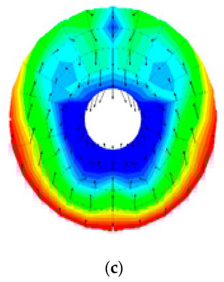 Comparison of nominal wake by ship types in EFD: (a) 158 K crude oil tanker Wn = 0.452; (b) KCS container ship Wn = 0.261; (c) 176 K bulk carrier Wn = 0.623 [25].