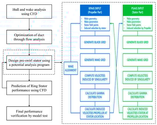 As shown in Figure 8, the fast region is rather wide despite the slow-speed ship’s wake. The developed accelerating-type ring stator seems appropriate, particularly for this type of vessel in consideration of fitting the high wake region. This device is also advantageous in avoiding the tip vortex risk from the stator tip to the propeller and rudder. Regarding stator design, the pitch angle is the most important factor. In a previous study [24], the potential-based pitch design showed a good correlation with the experimental results. In the case of duct design, the duct angle is determined by aligning the flow direction through CFD computation [26], and NSMB Nozzle 19A was adopted for the present foil shape. A parametric study of the duct and the stator was conducted with variations in diameter, a taper ratio of a stator, length and thickness of duct, and so on. The initial reference case was first determined, and then a parametric study was carried out as mentioned before. The flow chart of the overall ring stator design is shown in Figure 9.