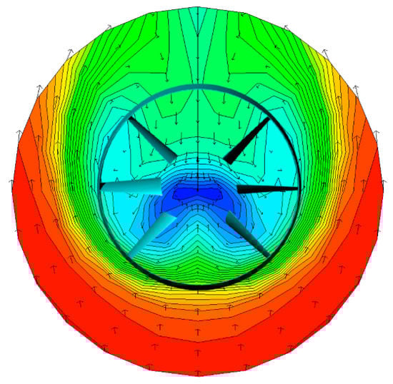 Considering the fast-flow region at the astern part, the standard diameter of stator and ring (duct) is set to be half of the propeller diameter that was decided based on the wake distribution as shown in Figure 10. Additionally, the chord and thickness of the stator are designed to be 10% less than those of the optimized corresponding values in [7], that is, almost the minimum value in consideration of structural strength. The most important parameter of the equivalent angle was determined to be 14°, which has been proven in various previous studies [27,28]. The ring stator is longitudinally located at 0.5R of the propeller, just ahead of the propeller position. The geometry of the initial reference ring stator is listed in Table 6, and the pitch angles at each blade are listed in Table 7. The blades were numbered according to each position, as shown in Figure 11 [29].