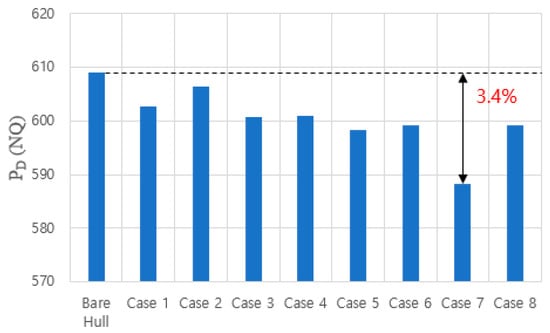 The computational results are summarized in Table 10, where the Delivered HorsePowers (DHPs) are compared. At the same design speed point, the DHP can be considered as the efficiency, although it is evaluated on the model scale. According to an increase in the diameter (Case 2), the efficiency became slightly worse than that in Case 1, which means that Case 2 was not beneficial because of the increase in diameter. Similarly, the efficiency of the wide chord case was worse than that of the small case (Case 3). The symmetric six blades case was slightly better than the reference. Based on the above results, six blades with a small diameter (half of the propeller diameter) and small chord length (3% of propeller diameter) were adopted. The pitch angles were finally varied to determine the optimum equivalent angle of attack, as mentioned before. An equivalent angle of attack of 15° (Case 7) was the best in terms of efficiency, as shown in Table 10. A comparison of the DHPs for all the cases is shown in Figure 13.