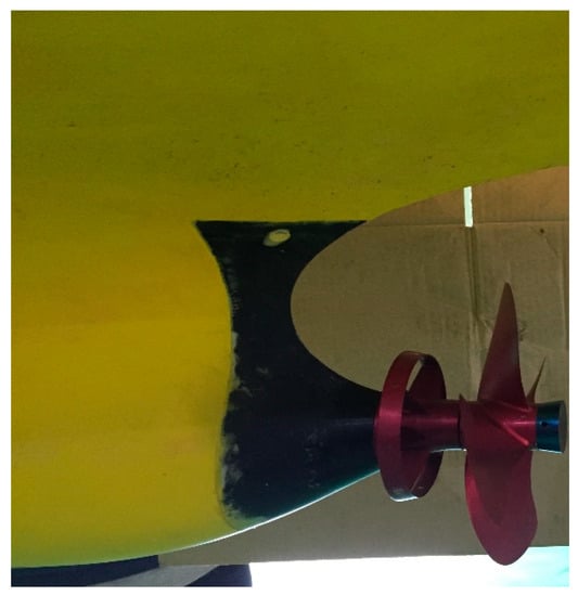 To validate the present design experimentally, the bare hull and best case (Case 7) models were manufactured, and model tests were performed at the towing tank of Pusan National University in Korea. The specifications of the target ship and propeller are shown in Table 11 and Table 12, and the model ship and its appendages are shown in Figure 14 and Figure 15.