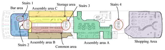 27]. The number, type, speed, and evacuation strategy of pedestrians in different areas are set in the evacuation environment. Based on the evacuation environment of the cruise ship, this paper verifies the rationality of the model through the simulation of the evacuation. Based on the data of the cabin, stairs, passage, bar area, assembly area, and storage area of the cruise ship, this research completes the construction of the cruise ship model. The construction diagram of the first layer is shown in