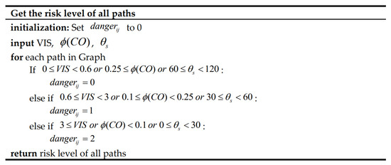 , the greater the impact on the evacuee’ moving speed. According to the range divided by Equations (3)–(5) corresponding to the three indicators of degrees of influence on evacuation, three risk levels of the path are defined according to the range, as shown in