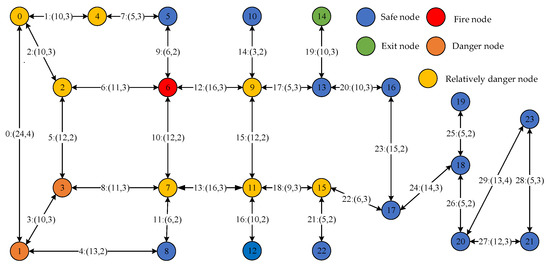 means that the risk level of the path is high, which is a dangerous state. When constructing the network topology for some other large buildings, the extended attributes of this paper can be used as a reference, such as crowd density, the shortest route, the types of nodes, and the risk level of paths. These extended attributes are conducive to the research of evacuation algorithms and can be applied to large buildings with similar evacuation structures [