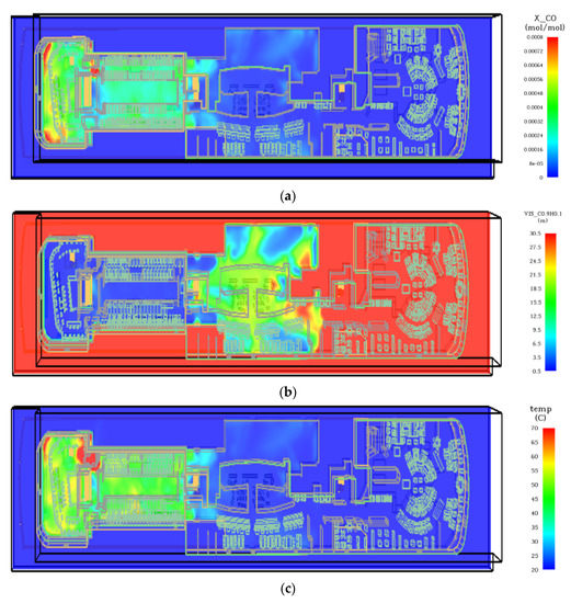29] studied the impact of these indicators on evacuation. In the actual evacuation, the temperature sensor, CO sensor, and visibility sensor can be used to detect the fire situation of each path. In addition, the sprinkler and smoke exhaust system can reduce and control a certain degree of fire. The influence of these three indicators on the evacuation coefficient [