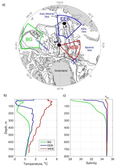 - Schauer, U.; Rudels, B.; Jones, E.P.; Anderson, L.G.; Muench, R.D.; Björk, G.; Swift, J.H.; Ivanov, V.; Larsson, A.-M. Confluence and redistribution of Atlantic water in the Nansen, Amundsen and Makarov basins. Ann. Geophys. 2002, 20, 257–273. [Google Scholar] [CrossRef]