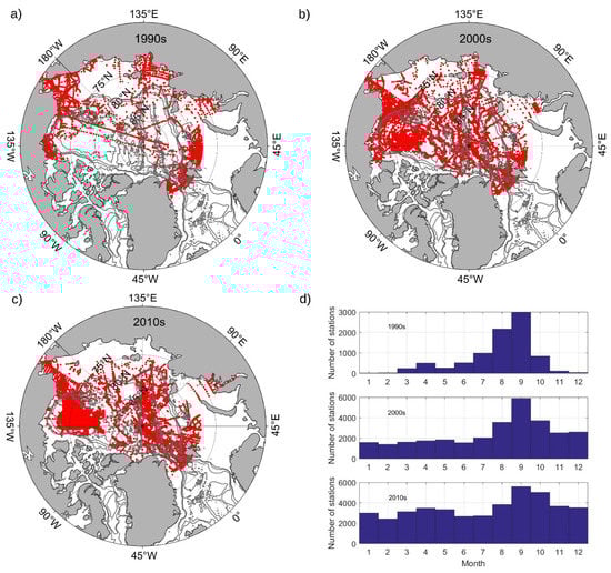 - Peralta-Ferriz, C.; Woodgate, R.A. Seasonal and interannual variability of pan-Arctic surface mixed layer properties from 1979 to 2012 from hydrographic data, and the dominance of stratification for multiyear mixed layer depth shoaling. Prog. Oceanogr. 2015, 134, 19–53. [Google Scholar] [CrossRef]