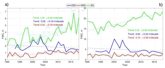 | Decade | Mean FWC, m  | FWC SD, m  | Basin Area, km2  | FW Volume,  km3  | FW Volume SD, km3  |