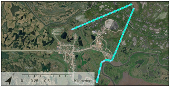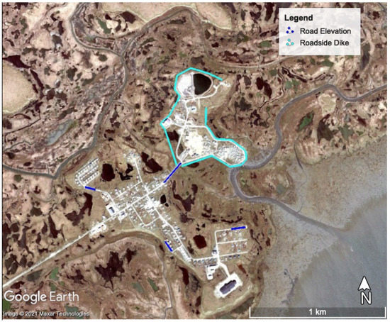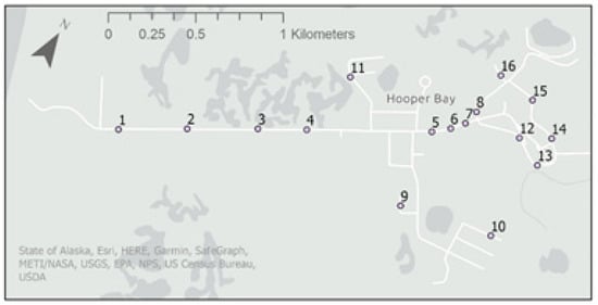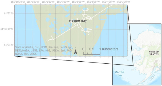 Hooper Bay is a city and Native Village of 1375 people [11] on the Yukon-Kuskokwim (YK) Delta that experiences annual flooding from storm surges (Figure 1). The YK Delta lies on the Bering Sea, and this sea marks the southern portion of the U.S. Arctic [12]. The community is divided into the northeast “Old Town” (61°31′52″ N, 166°5′45″ W) and southwest “New Town” (61°31′40″ N, 166°6′32″ W) connected to each other and to the airstrip by Airport Road. In 2017, the town finished a construction project that fortified the airstrip against coastal erosion and elevated the airport access road between New Town and the airstrip, improving airport accessibility during storms. The as-built plans for this project and the compilation of bids provided critical information for this study.