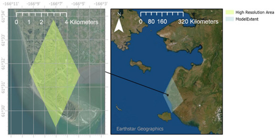 Delft3D model extent (right) and high-resolution model domain for Hooper Bay (left).