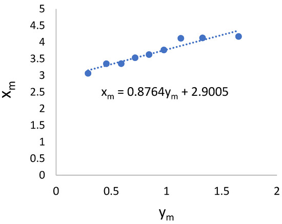 In the analysis, the Weibull distribution with k = 2 was found to best fit the data. The scale parameter A and the location parameter B were determined using linear regression, plotting the original x(m) data vs. the reduced variate y(m) data for the Weibull distribution and creating a trend line with Equation (2).